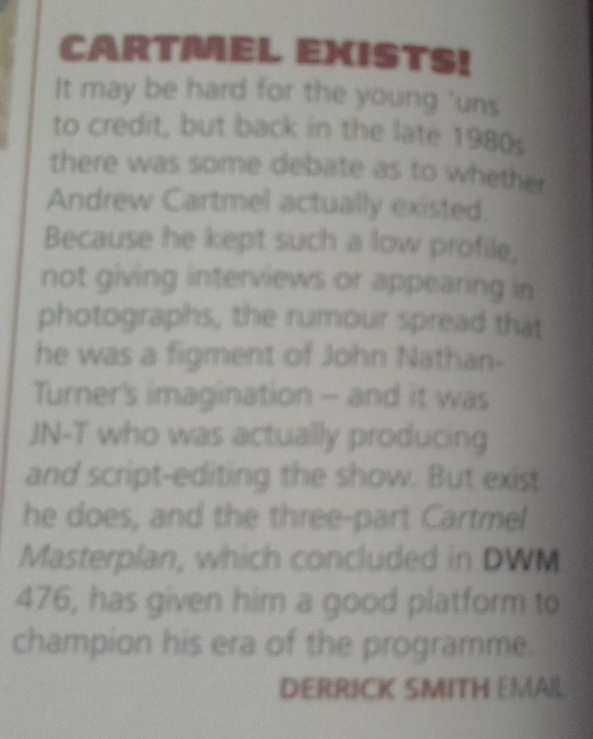 The phantom Cartmel rumour was only one of a range of strange theories and heated debates that raged in fandom during the late 1980’s and early 1990’s.  In retrospect, this was the golden age of Doctor Who fanzines.  Two things would help to kill the Doctor Who fanzine off – firstly the rise of the internet and secondly Gary Gillatt’s editorship of Doctor Who Magazine.  Gillatt wasn’t the first fan to edit DWM, but by recruiting writers who had cut their teeth on various ‘zines, he helped to make the magazine feel very much connected to fandom and the ‘zine culture.  This didn’t please everyone – some found it too insular and the in-jokes must have been baffling to newcomers – but for me, the Gillatt era of DWM is still my favourite.