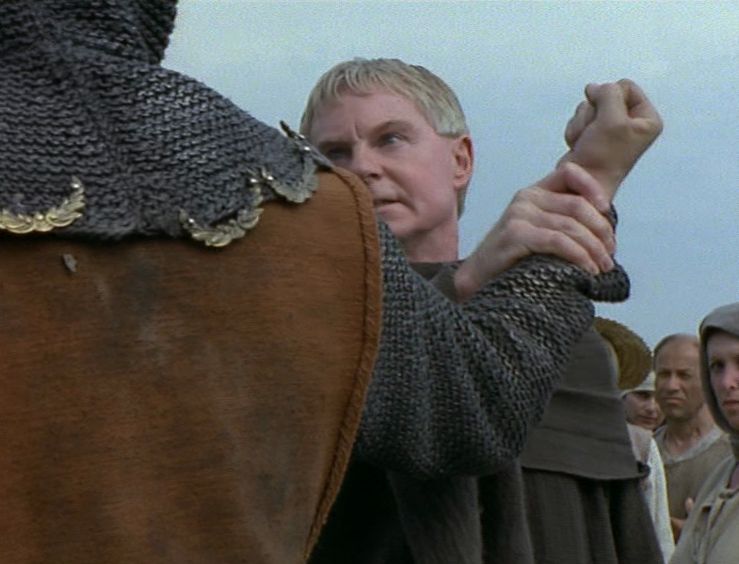Immediately after, we see Cadfael disarm a solider who had been attacking an unarmed man. It’s a moment invented for the series, but it works well as another shorthand moment to demonstrate that Cadfael is not only a man who will stand up for the underdog, but he also has the skills to do it.