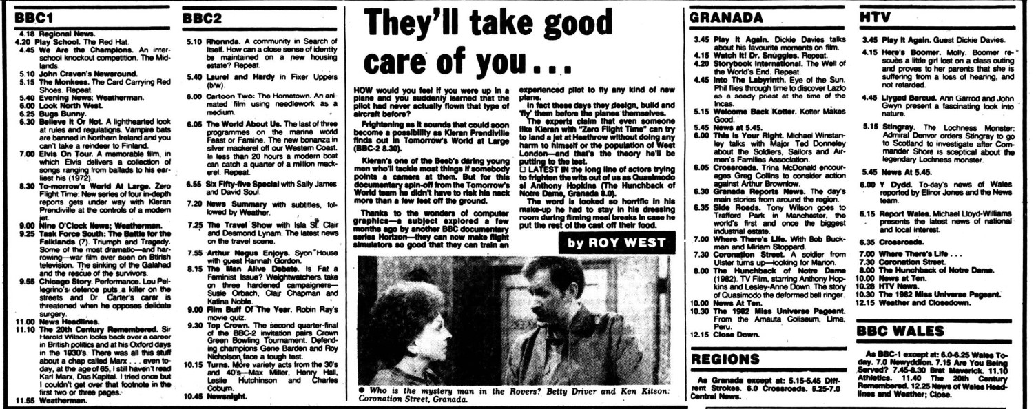 Since HTV was my local ITV network, I’m able to watch the Stingray crew investigate the mystery of the Loch Ness Monster (the local Scottish colour is an absolute hoot). Later there’s the delights of Coronation Street and The Hunchback of Notre Dame (which isn’t perfect, but a cast list which includes Anthony Hopkins, Derek Jacobi, David Suchet, Tim Piggott-Smith, Lesley-Anne Down, Robert Powell, John Gielgud and Nigel Hawthorne can’t be all bad).