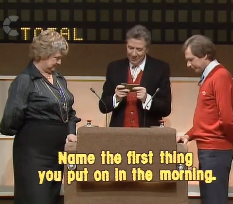 “And you have won a prize!” It’s the Max Bygraves era of Family Fortunes. At the time, and especially following Bob’s effortless command of the show, Max’s presentation seemed a lot more slapdash. But I’ve grown to find it appealing over the years (possibly as I nudge closer to Max’s age). Today there’s two teams of celebs battling it out – Agony Aunts vs TV-AM Presenters.