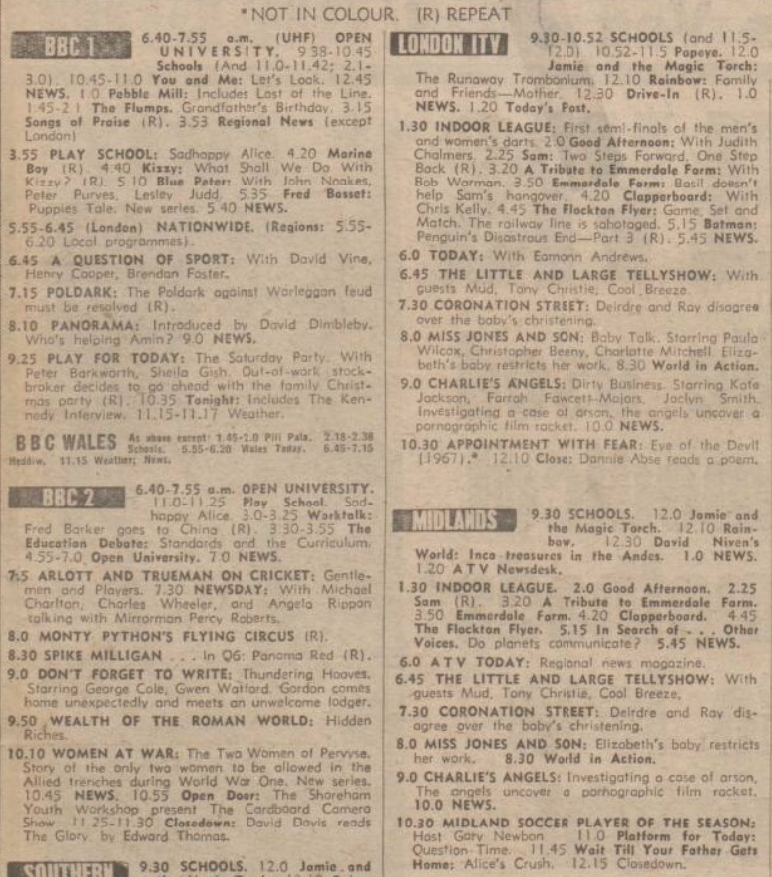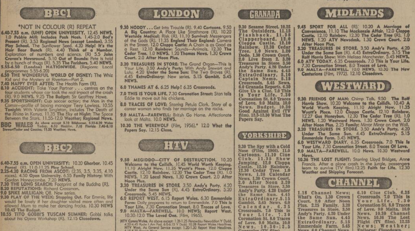 I’ve fired up the Randomiser, which has taken me back to 1977 to spend a week riffling through the television schedules. Hope there’s some good programmes to watch ….