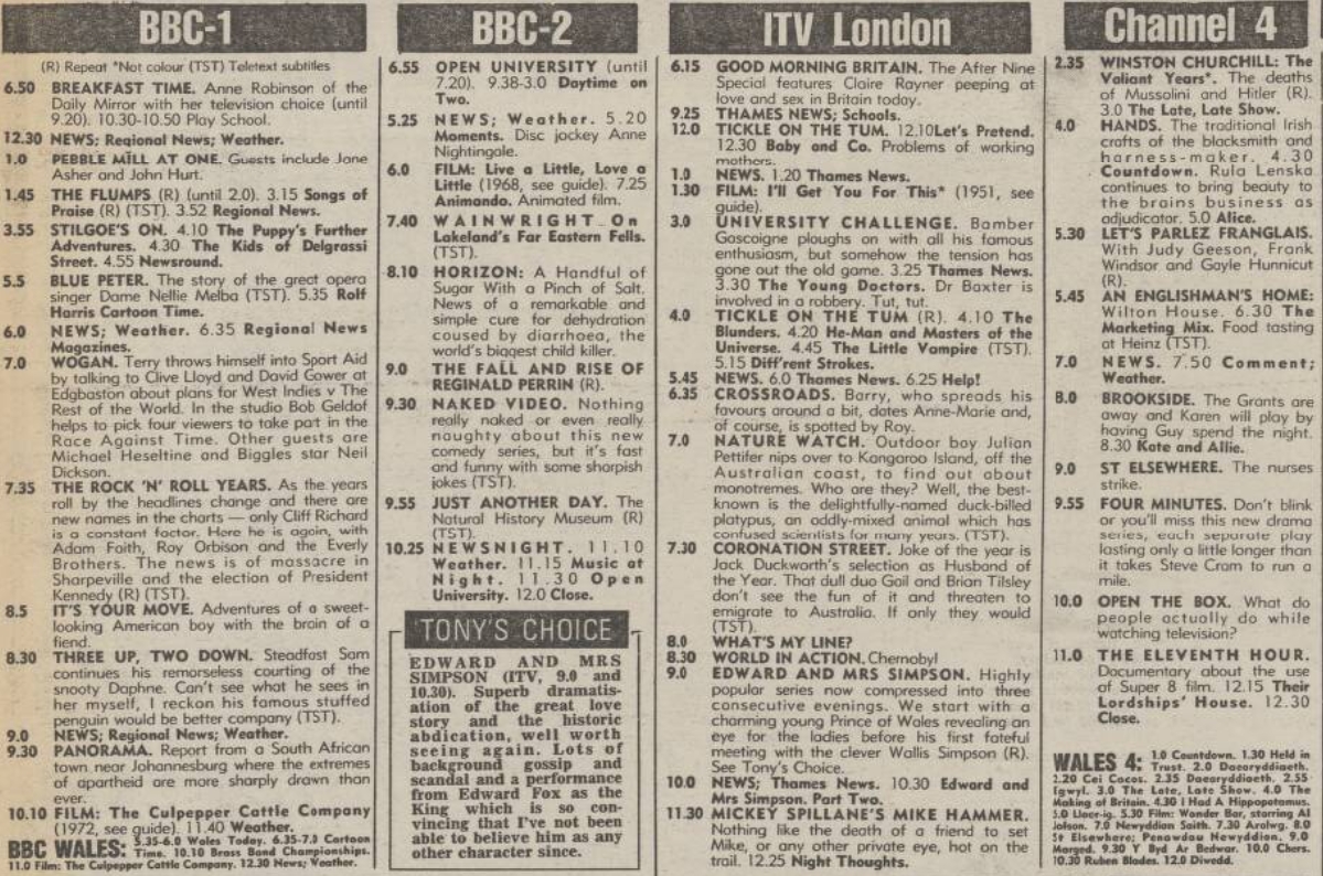 Moving over to BBC2, there’s another chance to see The Fall and Rise of Reginald Perrin. And on ITV’s there’s a re-run of Edward and Mrs Simpson, now stripped over three evenings. As it was originally broadcast in seven parts, it looks like it’s been trimmed down to fit six one-hour slots.
