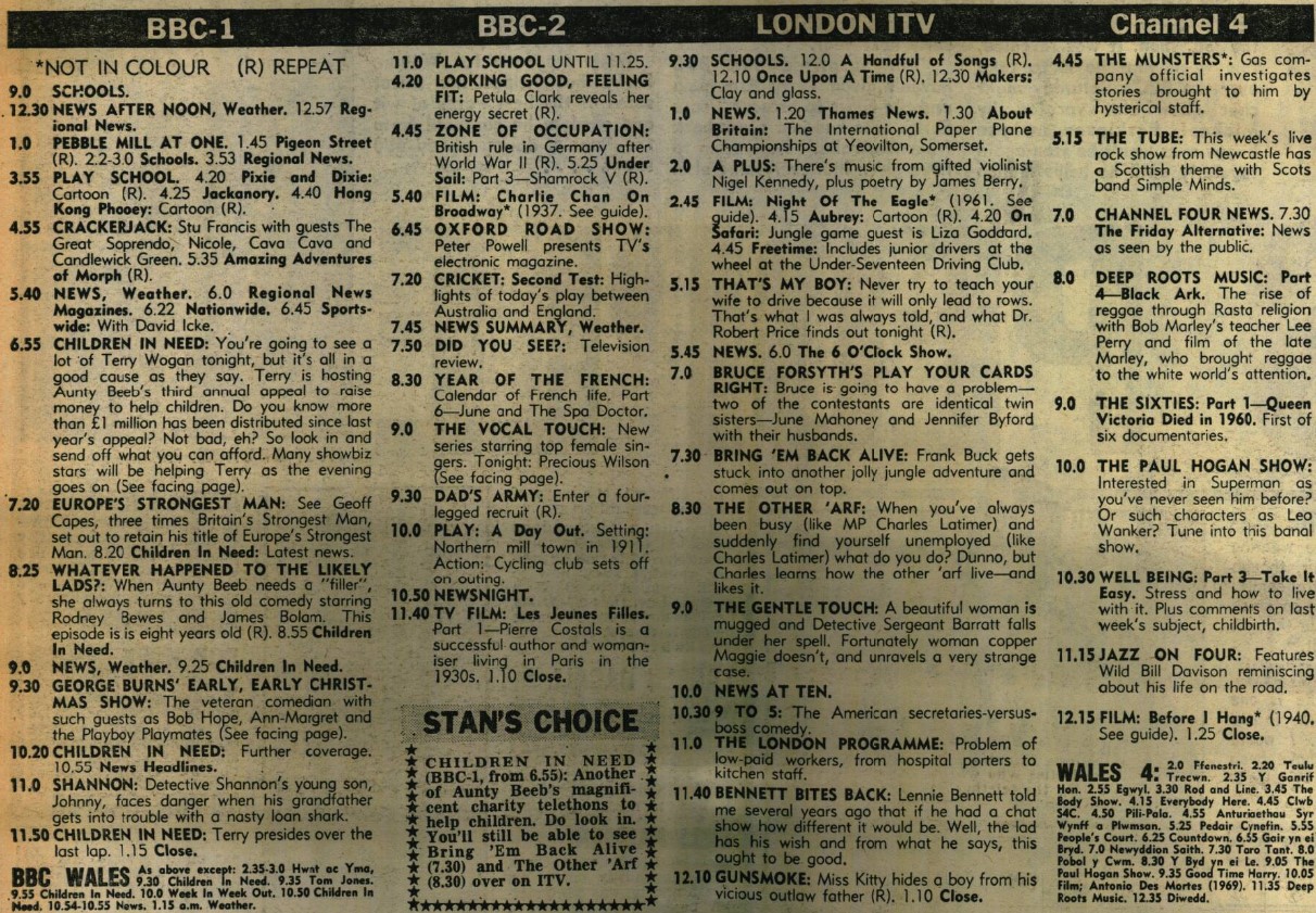 We’re back in the days when Children In Need didn’t dominate the entire BBC1 evening schedule. Indeed, it’s surprising just how little coverage there is (less is more, maybe?). From the available programmes, I’ll be taking Whatever Happened To The Likely Lads?