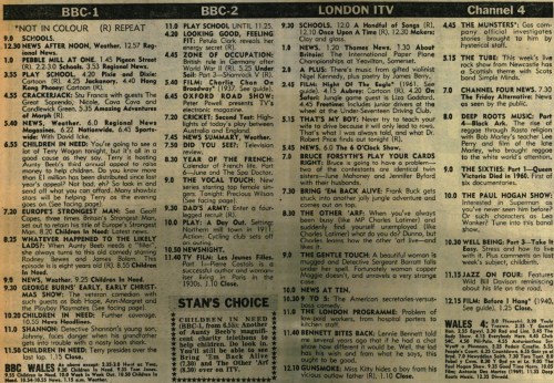 The repeats just keep on coming, although many of them (like The Rock ‘N’ Roll Years) are very welcome. It’s difficult to articulate today quite how magical this series was back then – when history (news, music, entertainment) wasn’t available at the click of a button, these half hour digests were windows into vanished worlds.