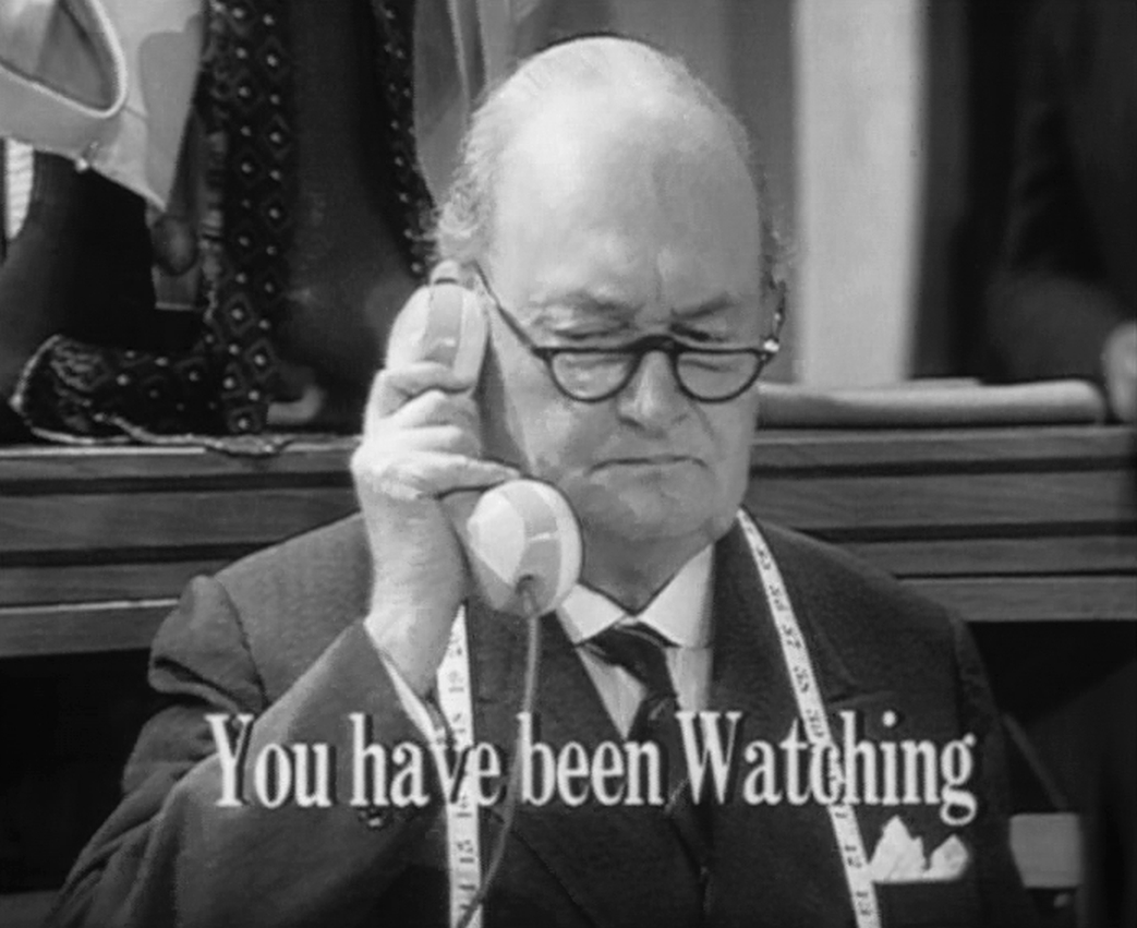 The episode opens on film at Ealing Studios with Mackay, Barrowclough and the silent (and never seen again) Mr Leach noisily striding down the metal walkways. This moment is played straight and since it directly follows on from the title sequence (which is rather bleak and also joke free) some viewers might have begun to wonder if this new programme was a drama rather than a comedy.