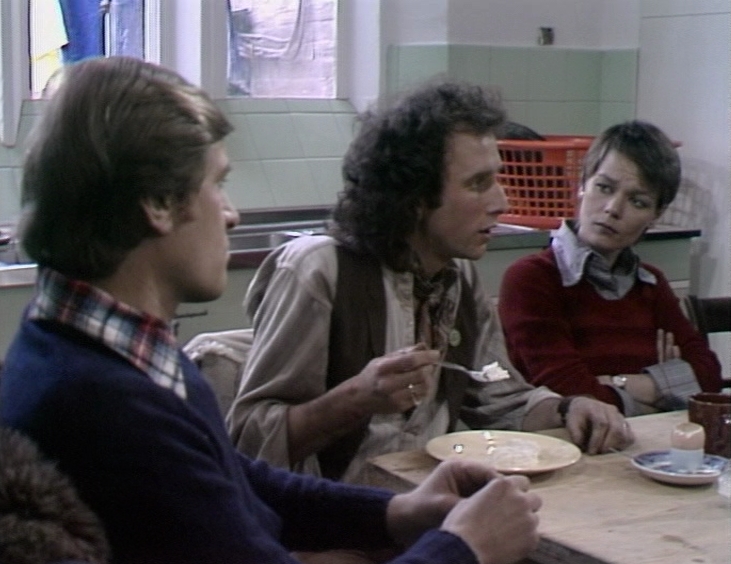 It’s clear though that her solo adventures are a great deal more uncomfortable than Abby’s. Jenny (whilst a resourceful person in many ways) is possibly not someone who would be able to survive on her own, so it’s fortunate that she later meets Abby and Greg. Before that though, she briefly runs into Tom Price (Talfryn Thomas). From their one scene here, you wouldn’t necessarily guess that he’d reappear and become a key figure in a number of early episodes. From this appearance it might be thought he’d be the series’ comic relief character, but we’ll see later that he also has his darker side …..
