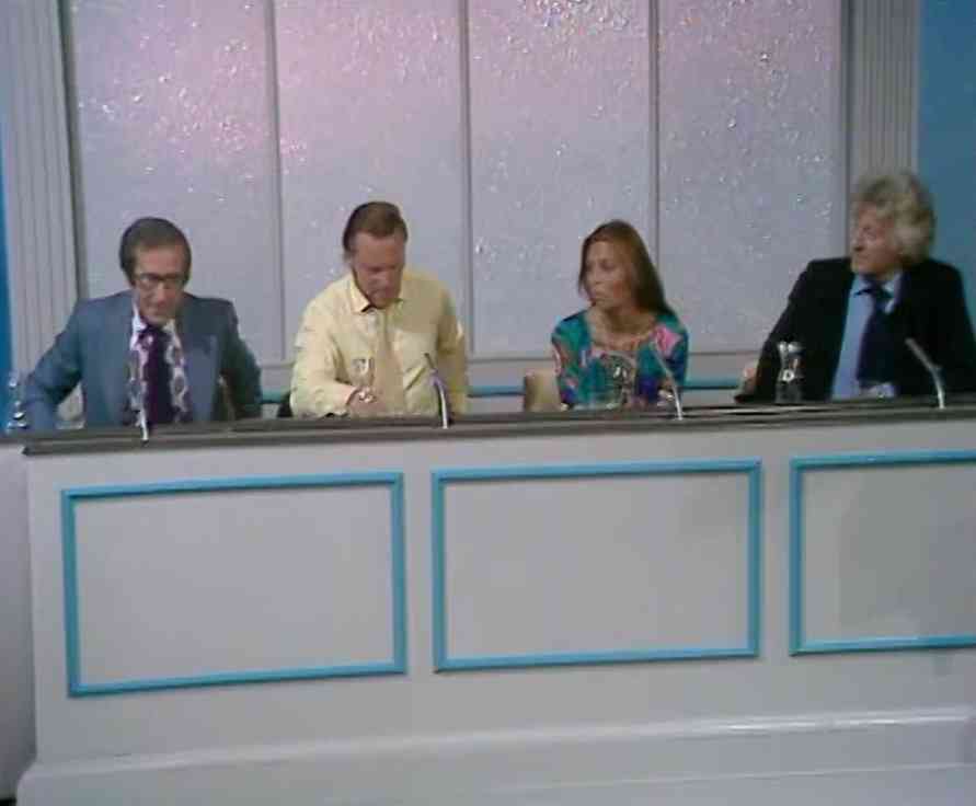 There were exceptions though. Jon Pertwee was irreverent throughout Knife In The Back (clearly he was eying Woodward’s job and imagining that, post Doctor Who, it would suit him quite nicely). Alfred Marks was another panelist whose tongue remained firmly in his cheek throughout.