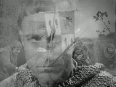 Whilst we’ve discussed before the problems of staging battles with such limited production resources, it’s disappointing that the Battle of Agincourt is so limply presented. There surely should have been a way to present it better than this. We see a shot of feet walking on the spot facing right and then switch to another shot of feet walking on the spot facing left. The shot then cuts back and forward several times – which is meant to illustrate the two armies marching towards each other. Then there’s a tight shot of soldiers engaged in a very slow battle, whilst Henry is placed in the foreground, looking towards the camera. The whole battle sequence lasts only twenty seconds or so.